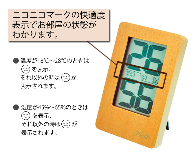 クレセル CRECER 温度計 湿度計 コンパクト 天然木 無垢 壁掛 スタンド リビング キッチン 子供部屋 寝室 見やすい おしゃれ かわいい 天然木 デジタル温湿度計 CR-2200W
