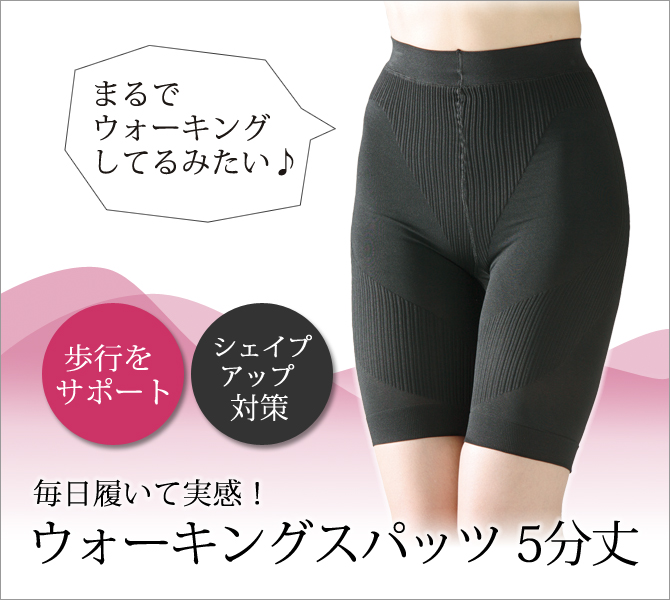 スパッツの各部分に編み方を変えたテーピング機能を施し、ウエストから膝上までの動 きをしっかりサポート!筋肉の動きを支えながら歩けるので普段動かしにくい部分をソフトに刺激!