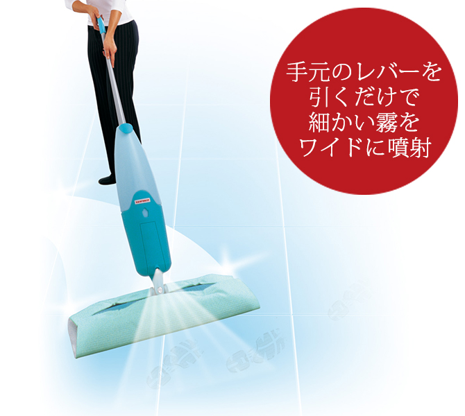 スプレー機能が付いたフローリングワイパーです。家具の下から階段までスミズミ手軽に掃除ができます。タンクに水と少しの液体洗浄剤を補充するだけ。手元のレバーを引くと、細かい切りをワイドに噴射します。1回の水の補充で、最大約400回スプレー可能です。