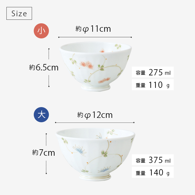 使いやすい軽量タイプの飯碗5客セットです。シンプルで可愛い飽きの来ないデザインだから、毎日の食卓で手軽に使えて便利です。おしゃれな花の模様が食卓を彩ります。来客時にも重宝します。赤(小)と緑(大)の2種類からお選びいただけます。