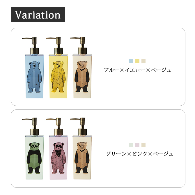 表情と立ち姿がかわいいクマのディスペンサーセット。樹脂製で軽く、割れにくく、使いやすいディスペンサーです。