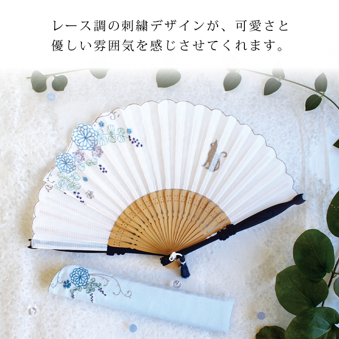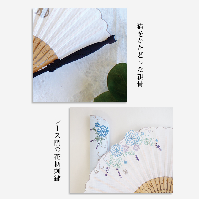 レース調の刺繍デザインが、可愛さと優しい雰囲気を感じさせてくれます。親骨の形状もオリジナリティ溢れる仕様になっています。