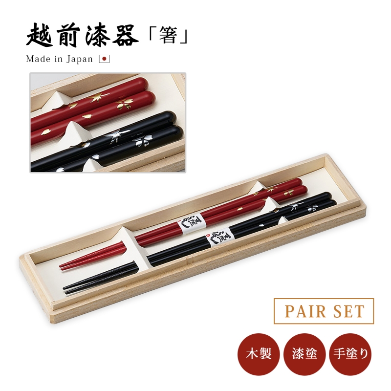 夫婦箸 箸 木製 日本製 桐箱入り 来客 越前漆器 桜 箸二膳 黒・朱 12-17001 うるし 艶 上品 木 漆塗 手塗 高級