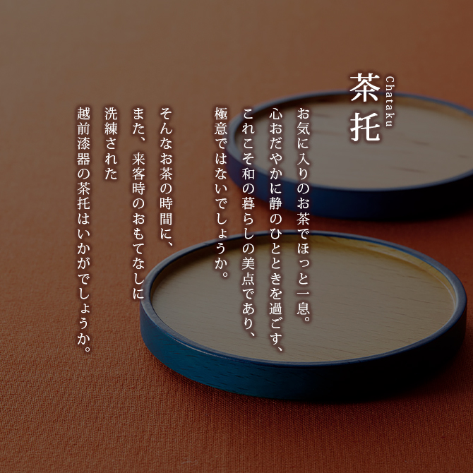 越前漆器の茶托5枚セットです。本漆手塗りの高級感あふれる茶托セットは、来客時にも重宝します。また大切な方への贈り物にもおすすめです。