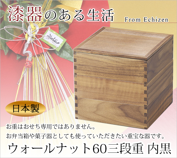 重箱 お重 3段 四角 6寸 おせち ウォールナット 木製 日本製 越前漆器 上品 定番 漆器 高級 正月 弁当 菓子器 ウォールナット60三段重 内黒 12-15001