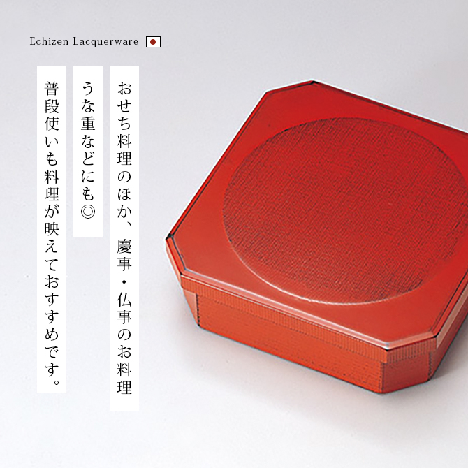 「越前漆器 重箱」お重はおせち専用ではありません。季節のお菜を盛ってよし、お弁当箱や菓子器としても使って頂きたい重宝な器です。