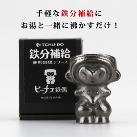 長野県茅野市の棚畑遺跡から出土し、国宝に指定されている土偶、縄文のビーナスがモチーフの南部鉄偶(南部鉄器)です。溶出する鉄分を利用し、やかんや鍋に入れて鉄分補給のほか、貝の砂出し、黒豆やなす漬けの色だしなどに古釘の代用としてお使い頂けます。安定して直立しますので、置物やオーナメントとしてもお楽しみ頂けます。